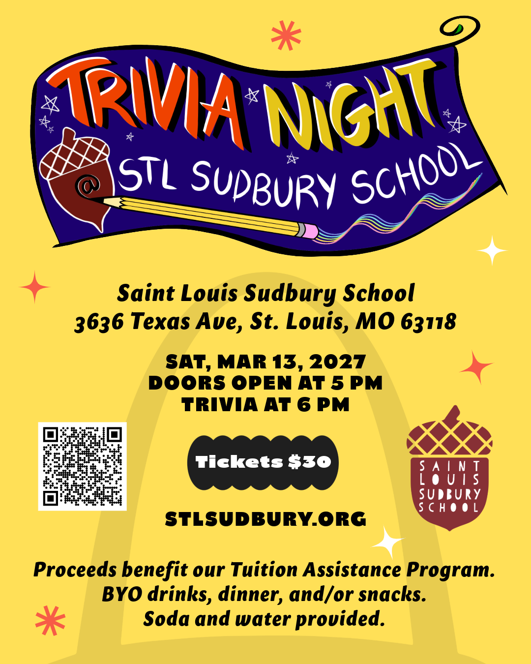 Join us for a playful evening of trivia on Saturday, March 13, 2027! Doors open at 5 pm and trivia begins at 6 pm. All proceeds benefit Saint Louis Sudbury School's Tuition Assistance Program and General Operating Fund.